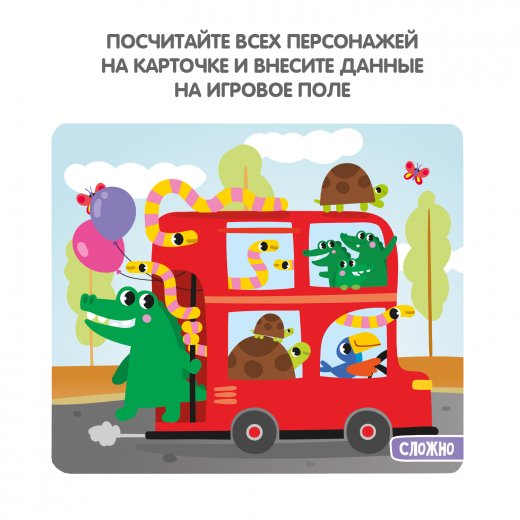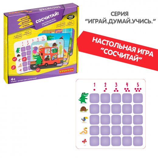 Настольная игра "СОСЧИТАЙ!" серии "Играй Думай Учись" - это 10 красочных сюжетов, на которых изображены пять видов забавных персонажей в различных ситуациях.