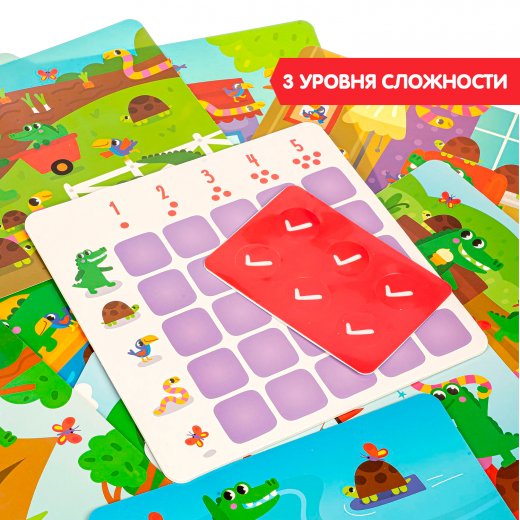 Игра на счет и внимательность: нужно найти и посчитать всех персонажей на конкретном рисунке, а затем внести результат на игровое поле с помощью наностикеров.