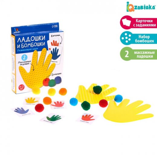 В комплекте: 2 массажные ладошки, бомбошки и карточки с заданиями.