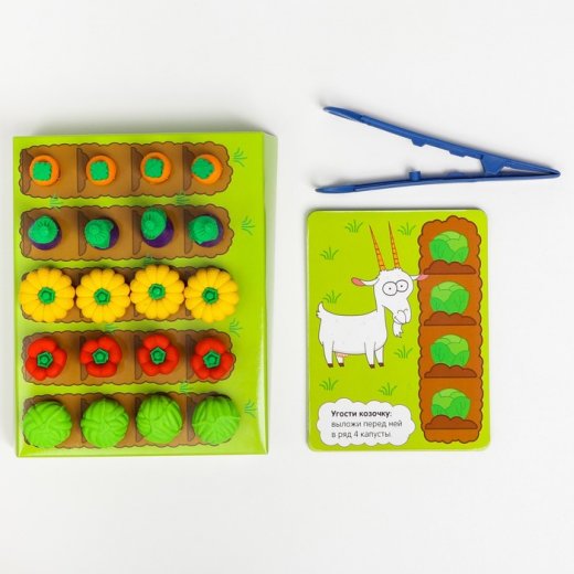 Обучающий набор «Мой весёлый огород» — это 40 красочных игрушек овощей и фруктов, 10 логических заданий, яркие карточки и объёмное игровое поле. Теперь малыш останется довольным, ведь вокруг него будет столько сочной красоты!