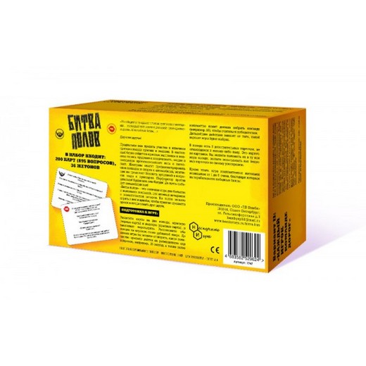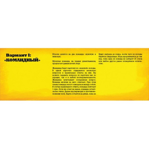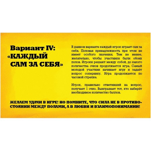 Та команда, которая наберет большее количество очков – признается сильнейшим полом! Но ненадолго. В составе игры 200 карточек и 895 вопросов! Так что пальма первенства может переходить из рук в руки и не единожды!