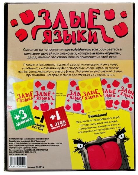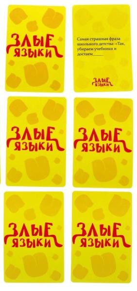 Настольная игра Злые языки невероятно веселая, позитивная, и местами немного неприличная, но это ее только красит. Не случайно заядлые игроки в "Злые языки" предупреждают: "Осторожно, игра вызывает неконтролируемый смех!". И это чистая правда. Если вы не обременены высокими моральными ценностями и у вас устойчивая психики, но Вы любите приколы и не прочь посмеяться над приколом, то эта игра как раз предназначена для вас! Игра "Злые языки" это то, что нужно брать с собой на самые отвязные вечеринки и кайфовать в любимой компании!
