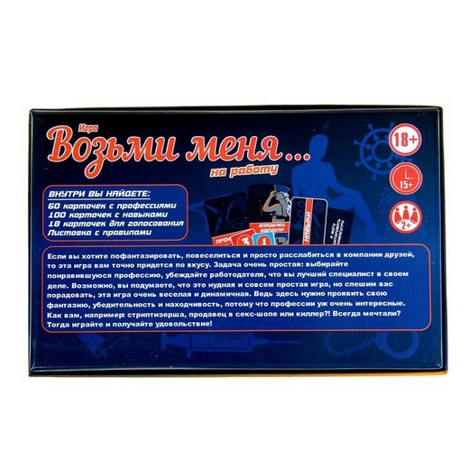 Настольная игра «Возьми меня на работу» это потрясающий тренажер, который подготовит совершеннолетних игроков к прохождению настоящих собеседований! Провокационные вопросы карточек и неординарные профессии! Проявите свою креативность и находчивость на пути к достижению главной цели – получении работы своей мечты!