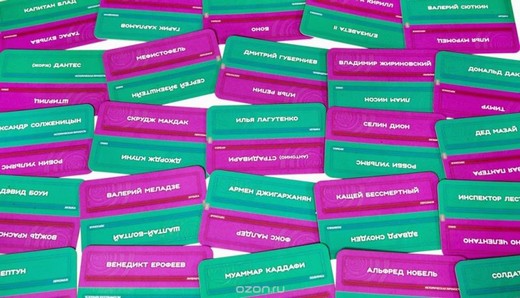 В игру входят 4 сотни карточек на которых написаны имена известных всем людей. Здесь представлены актеры, музыканты, политики, спортсмены, герои кино и мультфильмов. Но это лишь одна из задач, так объяснить, кто такой Суворов, Джим Керри или БагзБанни, чтобы их угадали.