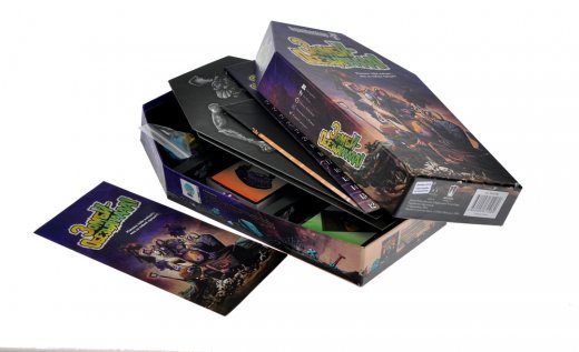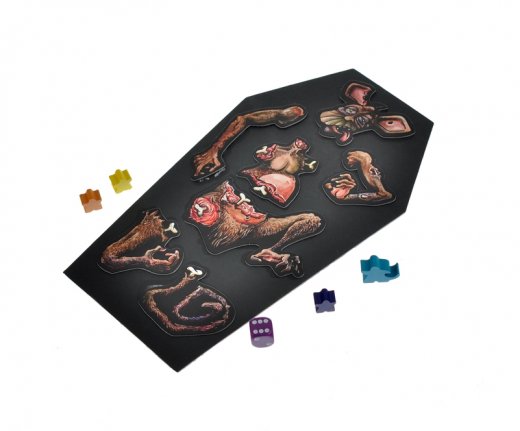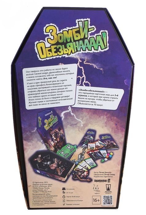 Состав: 120 карт, 6 разноцветных деревянных фишек, фишка макаки-упыряки, игровое поле набора высоты, 7 частей макаки-зомби, поле сборки макаки-зомби, кубик для сложных ситуаций, правила игры.