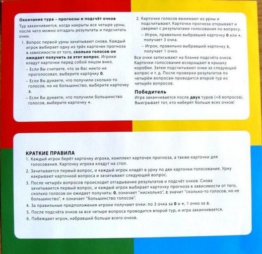 1. Каждый игрок берет карточку игрока, комплект карточек прогноза, а так же карточки для голосования. Карточку игрока кладут на стол.