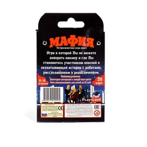 Настольная игра "Мафия" - одна из самых популярных психологических игр современности. Она соединила в себе все - втягивающую механику, интригующий сюжет, общение в процессе игры, облегченный состав. Если Вам и Вашей компании нечем заняться или охота так провести время, чтобы запомнить его на долго, то Мафия - лучший вариант. С ней вся Ваша компания (сколько бы ни было человек в ней) сможет живо и активно провести время, здесь невозможно отсидеться, задействованы будут все!