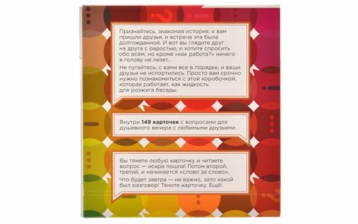 Вопросы составлены таким образом, чтобы «вытащить» как можно больше интересных историй из обсуждения. Наши тесты показали, что даже друзья, которые знают друг друга десятилетиями, нет-нет, да находят что-то новое и интересное. Что-то такое, чего ещё не знали друг о друге. Список вопросов специально подобран так, чтобы «раскрутить» компанию на очень интересный диалог. После него вы точно будете знать друг друга лучше. И часто — с неожиданной стороны.