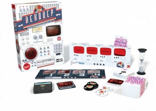 В настольной игре "Декодер" игроки соревнуются в двух командах, каждая из которых пытается правильно отгадать закодированные сообщения, представленные товарищами по команде, взламывая коды, которые они перехватывают от команды противника.