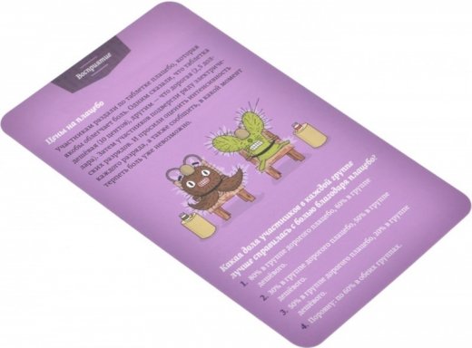 Каждый ход вы зачитываете один вопрос и четыре варианта ответа. А затем обсуждаете: нужно сообща выбрать один вариант. Ошибётесь трижды — проиграете. Правильно ответите на пять вопросов — победите!