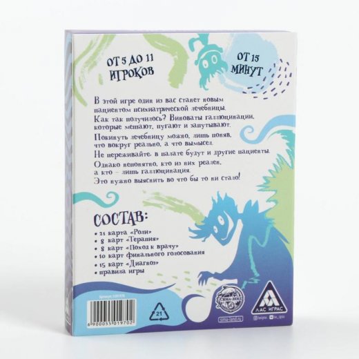 Для начала разделите карты на колоды: «Роли», «Терапия», «Поход к врачу», «Диагноз» и карты финального голосования. Каждый из участников взакрытую получает карту роли — пациента или галлюцинации, а ещё карту диагноза. Также в игре будет игрок «Новичок», которому и предстоит выяснить, кто есть кто. Этот участник получает 8 карт «Поход к врачу» и «Терапия». Количество карт «Терапия» зависит от количества игроков.