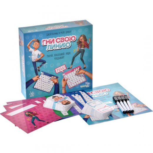 Кровать – это мышь, утюг и конверт, а решётка – ёлка, ракета и галстук. Не понимаете? Вот и вашему товарищу по команде будет трудно понять, ведь объяснять всё это вы будете молча. Настольная игра "Гни свою линию" полна веселья и творческого подхода! В ней принимают участие от 2 до 4 команд по 2 человека. Один из членов команды – художник – вытягивает карту и рисует на своём планшете тайное слово, соединяя по порядку разные значки. После этого звуками и жестами он объясняет своему напарнику, какие значки тот должен соединить на своём планшете, чтобы получился такой же рисунок. Та команда, игрок которой первым назовёт загаданное слово, побеждает.