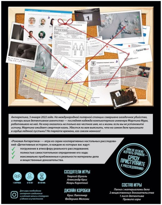 Кто победил?Каким будет финал, зависит только от участников. Вы можете двигаться неторопливо и вдумчиво, исследуя улики, а когда в вашей голове появится имя преступника, его необходимо ввести по QR-коду в специальное поле, в котором хранится правда. Вооружитесь логикой и раскройте таинственное заполярное убийство!