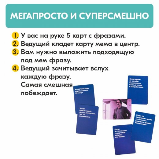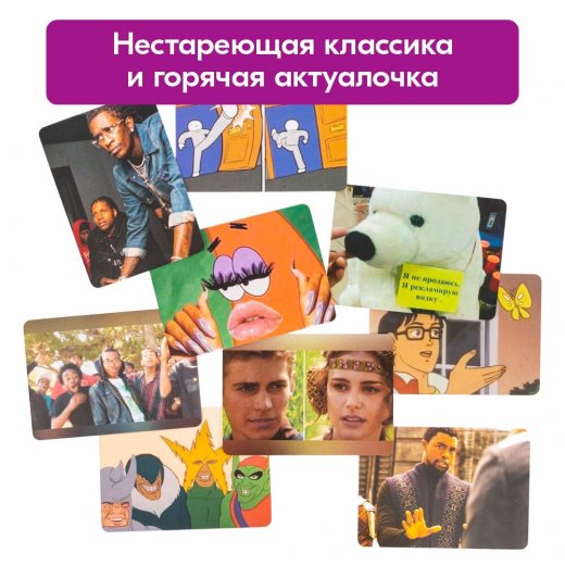 Зовите друзей, открывайте коробку — и понеслась! Эта игра сделает вашу вечеринку незабываемой. Подбирайте мемы к смешным фразам или фразы к мему — получайте уморительные реакции и веселитесь!