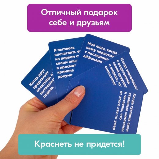 - Перемешайте все карты фраз. Решите, с какой стороной карт будете играть — с синей или фиолетовой. На фиолетовой стороне более приличные фразы и ситуации, на синей — для компании, готовой ко всему.