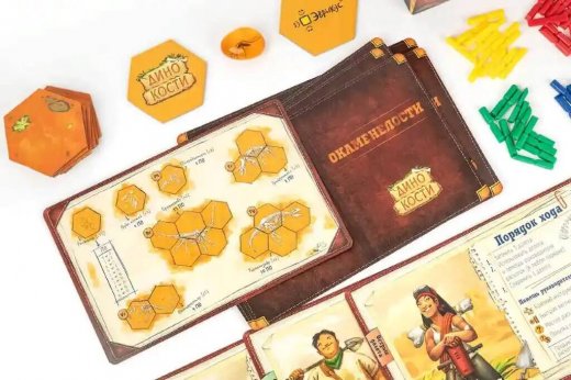 "Динокости" - это много отличных компонентов в небольшой коробочке: тайлы окаменелостей из очень плотного картона, кристаллы янтаря, пластмассовые долота в цветах игроков, а также планшеты и карточки. Отдельно скажем про маркер первого игрока - это большой кусочек янтаря с комаром внутри - невероятно круто! Иллюстрации выполнил художник Эндрю Босли, забавные и красивые они идеально подходят этой семейной игрой.