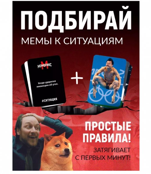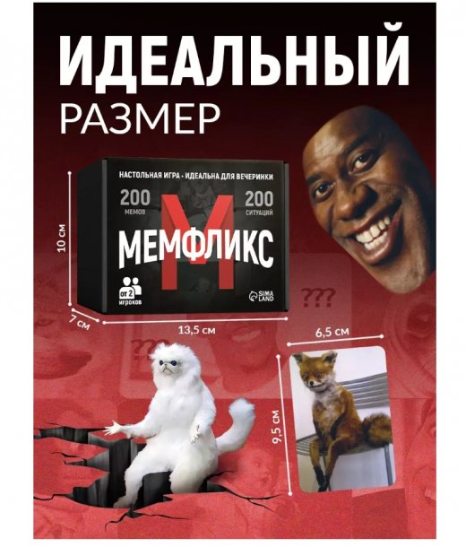 Мемология может стать вашей семейной традицией для вечеринок и досуга в кругу друзей и близких. Коробка мемов подойдет как подарок по любому поводу для взрослых, подростков мальчиков и девочек. Возьмите мемную настолку с собой в дорогу на улицу для пикника в поездку или отдых на природе и развлекайтесь всей компанией! Благодаря своей простоте и оригинальности идеально подойдет для двоих игроков или большой компании. Настольная игра наполнена популярными мемами, которые часто видим в интернете, позволит окунуться в мир смешных картинок и ситуаций. Мем мастер позволит повеселиться, развивает логическое мышление, вам придется сочетать карты с мемами и создавать забавные комбинации. Стимулирует креативное мышление. Благодаря разнообразию карт, подходит для всех - для большой компании друзей, знакомых и близких. Постарайтесь ответить на вопросы "какой ты мем?" - создайте собственную коллекцию забавных мемов! Как играть? • Карты мемов и ситуаций перемешайте в разных колодах, положите их на стол. • Ведущий раздаёт всем по 5 карт с мемами. • Ведущий берёт из колоды карту с ситуацией и зачитывает одну из сторон. • Игроки выкладывают на стол по одной карточке с мемом, который лучше всего подходит к озвученной ситуации. • Ведущий выбирает лучший мем. Владелец мема забирает карту с ситуацией себе. Сыгранные мемы отправляются в сброс. • Все пополняют руку до 5 карт. • После этого ведущим становится следующий по часовой стрелке игрок. Идеальный подарок парню и любимой девушке на День Рождения Выпускной Новый год. Сделай подарок папе, подарок мужчине, подарок мужу, парню, любимому, молодому человеку и коллегам на любой повод! Это оригинальный и веселый подарок для мамы девушки сестры подруги любящей, который подарит юмор и смех! Дайте фору скучным будням, окунитесь в атмосферу хорошего настроения и легких шуток. Настольная игра для взрослых "Мемфликс" порадует каждого ценителя интеллектуальной развлекательной игры. Похаваем?