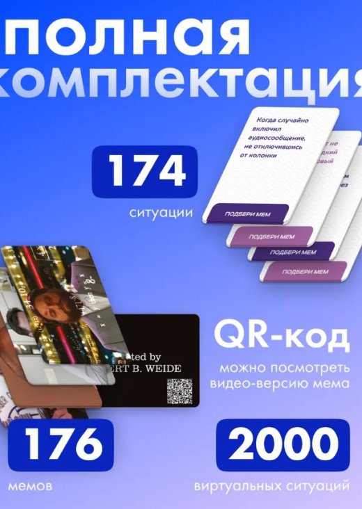 В комплекте игры - 176 мемов и 174 ситуаций, которые вы можете использовать и воплощать. В наборе игры есть много популярных мемов, которые вы наверняка знаете. Защитное покрытие карточек обеспечивает им долговечность использования и сохранение изначального вида. Такая веселая развивающая игра для двоих или большой компании по типу карты мемы 2 ствола, что за мем, мемограм подойдет для праздников и вечеринок на даче или дома. В нее можно играть как в квартире, так и на улице, на природе в теплую погоду. Для нее не требуются дополнительные аксессуары, кроме гладкой ровной поверхности и чашечки вкусного напитка. Крутая интеллектуальная викторина для нескольких игроков заменит собой другие игрушки и станет отличным вариантом времяпровождения. Игра для умников и умниц способствует развитию логического мышления, эрудиции и интеллекта. В интересную развлекательную мемополию могут играть девочки и мальчики - подростки и школьники, молодые девушки и парни. Игровой формат подарит вам много радости и поможет создать атмосферу юмора и веселья на празднике по любому поводу. Коробку можно взять с собой на отдых, в дорогу, поезд, благодаря удобному формату она не займет много места среди других вещей и поможет скоротать время в пути. Классическая настолка может стать дорожным, домашним, уличным видом развлечения.