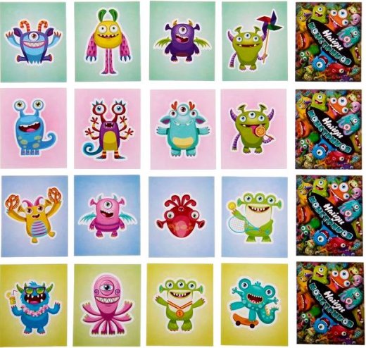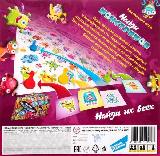 Настольная игра Найди монстриков – это довольно интересная и увлекательная, развивающая игра для детей и взрослых. Смысл заключается в поиске монстриков на поле. В свой ход игрок берёт из колоды три карточки и кладёт их перед собой в ряд рубашками вверх. Затем поочередно переворачивает карточки картинками вверх. Как только карточки открыты, все остальные игроки начинают искать на игровом поле монстриков, которые нарисованы на открытых карточках. Вроде бы и задание простое, но есть свои особенности: есть куча одинаковых монстриков, которые отличаются положением лап и другими мелочами, поэтому игра интересна даже для взрослых. Карточек очень много, играть можно долго. Кроме предложенных вариаций можно самостоятельно придумать много правил и искать монстриков на скорость, закрывая карточки и пр. Интересна и для семейного отдыха, и для детской игры.