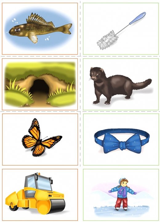 Разные картинки, одинаковые слова – это довольно занимательная и познавательная игра для ребенка, которая увлечет его и поможет познакомится со многими словами и их значениями. Перед началом игры разрежьте карты по пунктирным линиям. У вас получится 56 карточек с картинками и 56 карточек со словами. Играть можно разными вариантами. Например раздайте детям карточки с картинками а у себя оставьте со словами, затем покажите любое слово, а дети пусть найдут к ним картинки или наоборот.