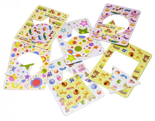 Каждая карточка имеет внутри часть, которую можно вынуть. Все внутренние части разные по форме. Задача ребёнка собрать карточки, ориентируясь на изображения и форму вырубки.