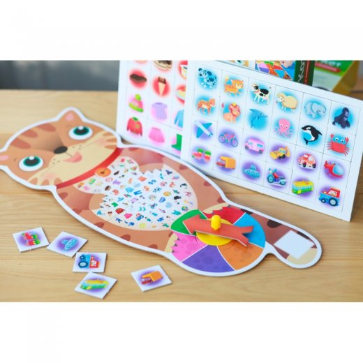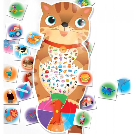 Набор содержит 144 карточки с изображением предметов и персонажей из 6 тематик. Игровое поле представляет собой кота с изображениями предметов и волчком в лапах.