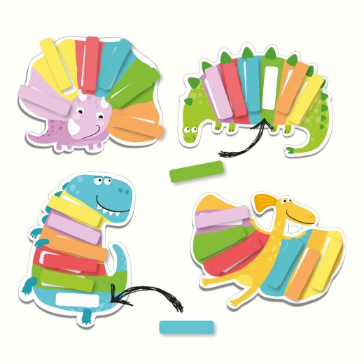 В наборе имеется четыре карточки в виде динозавров, раскрашенных в шесть цветов, а также 24 фишки-полоски, окрашенные в те же цвета. Перед игрой малышам необходимо расположить перед собой одну из карточек-динозавриков, а цветные фишки-полоски выложить в ряд яркой стороной вниз. Первый игрок берет по одной фишке, называет цвет и кладет на место соответствующего цвета на своем динозаврике. Если ему попадается фишка с цветом, который уже есть на его карточке, то ход переходит к следующему ребенку. Игра завершается, когда чей-либо динозаврик соберет все шесть цветных фишек.