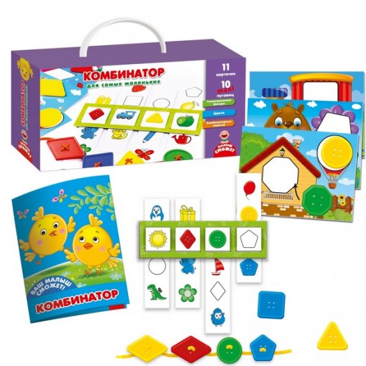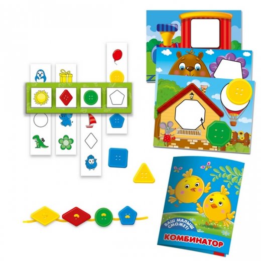 Комбинатор – это приспособление, с помощью которого вы найдете множество вариантов выкладывания или нанизывания пуговиц. Просто двигайте картонные дорожки и выкладывайте пуговицы в необходимой последовательности. Вариантов игры настолько много, что малыш точно не заскучает!