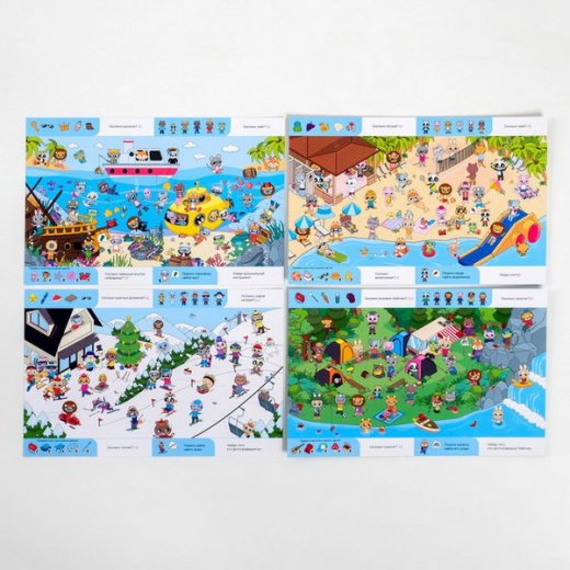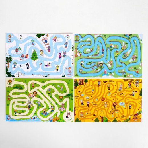 В этой игре вы найдёте 4 ламинированных поля. В них вас ждут увлекательные задания на счёт и поиск предметов или персонажей. А на обороте каждого поля находится занимательный лабиринт.