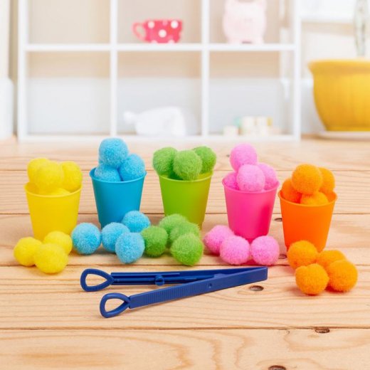 В комплект входят 50 ярких шариков-бомбошек 5 цветов, 5 цветных стаканчиков и пинцет для сортировки.
