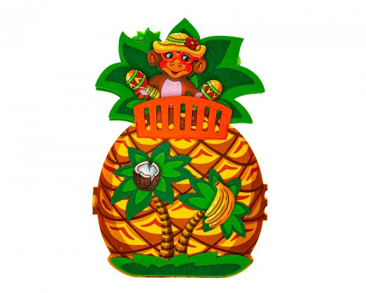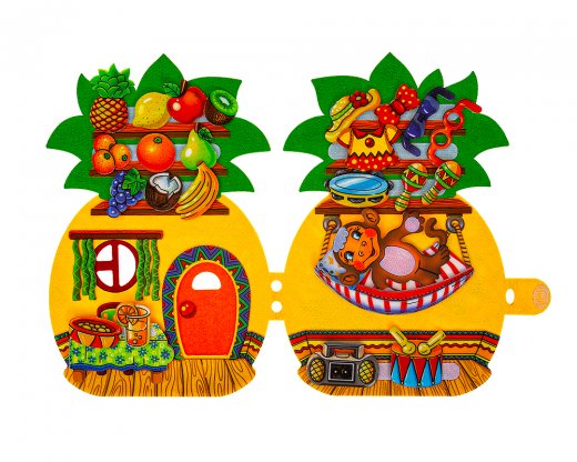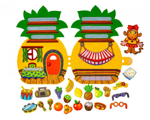 1. Игра "Добро пожаловать в гости!" Предложите ребенку "отправиться в гости" к обезьянке. Рассмотрите ананасовый домик, попросите найти и показать столовую комнату, спальню, гамак, балкон. Обратите внимание ребенка на пальмы, растущие под балконом. Спросите, какие фрукты могут расти на пальме? Попросите ребенка назвать, какие фрукты любит обезьянка. Спросите, какую одежду, головные уборы и аксессуары она носит.