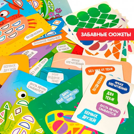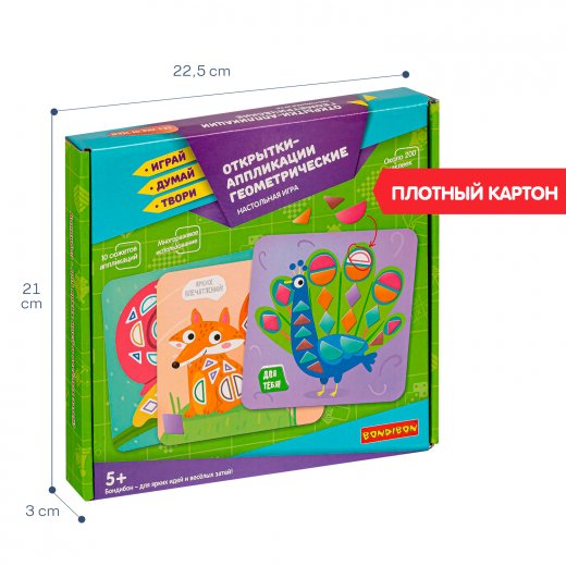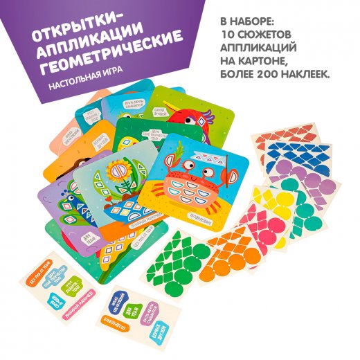 Настольная игра "ОТКРЫТКИ-АППЛИКАЦИИ ГЕОМЕТРИЧЕСКИЕ" серии "Играй Думай Твори" от Bondibon - это набор из 10 забавных сюжетов для аппликаций наклейками. Наклейки имеют три геометрические формы и восемь цветов, благодаря чему набор обладает развивающими и обучающими свойствами.