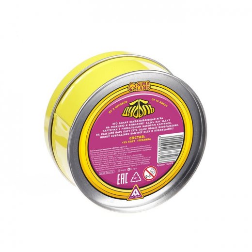 Теперь любимая игра на внимание и реакцию в жестяной коробочке! Внутри вас ждёт 55 карт с уникальным набором картинок. На каждой паре карт есть одно общее изображение. Его-то вам и нужно найти! Кстати, в обычной игре «Дуббль» карточки с белым фоном, а здесь — с цветным. На процесс игры это не влияет, просто делает карточки ещё ярче!