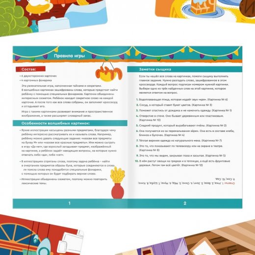 Когда ребёнок соберёт все слова, он переходит к кроссворду в заметках сыщика. Там малыша ждут 10 вопросов. Ответом будут слова, которые он нашёл на карточках. В итоге игрок должен получить главное — одиннадцатое слово.