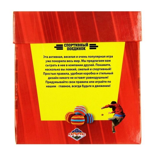 Настольная игра «Спортивный поединок» знакомит юных игроков со знаменитой игрой под названием «Сокс». Суть ее заключается в том, чтобы перекидывать мяч от одного игрока к другому не используя рук! Да-да, именно так. Мяч нельзя уронить. При этом его вязанная структура дает множество способов взаимодействия с ним для игроков.