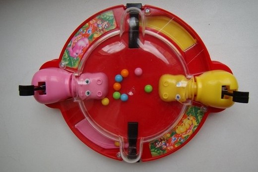 Играть могут два, три или четыре человека. Игру начинает любой из играющих. В пазы, расположенные в углах игрушки, слева от “бегемотиков” укладываются шарики, которые по одному скатываются на клавиши. Резким нажатием на клавишу выбросить шарик на основание. Нажать на рычаг, расположенный на спине "бегемотика". При этом “шея” с “головой” выбрасываются вперед, а поднятая “голова" захватывает шарик, который затем скатывается в углубление справа от “бегемотика”. Выигрывает тот, кто наберет большее количество шариков.