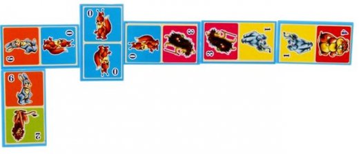 Домино Веселые зверята – представляет собой настольную игру, которая позволит детям всех возрастов весело провести время. Костяшки домино украшены цветными картинками с изображением различных веселых зверушек, которые непременно понравятся и привлекут внимание ребенка. Суть игры состоит в том, чтобы добавлять на игровое поле одну из своих костяшек таким образом, чтобы картинка на ней подошла к изображению другой, уже выложенной, костяшки. А если дети уже обучены счету, то можно ориентироваться на цифры (точки). Правила игры весьма просты: