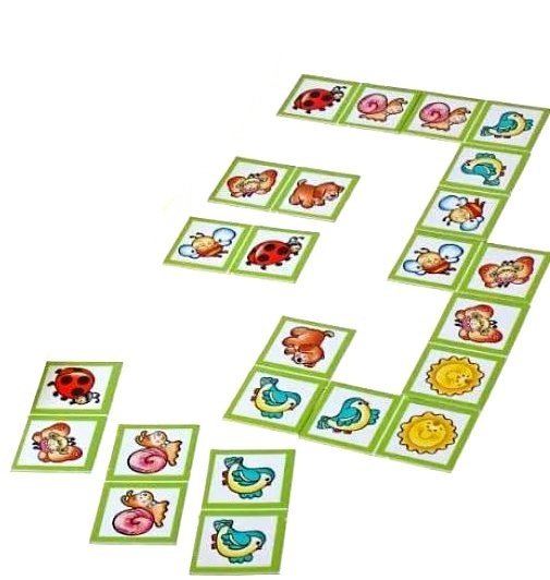 Играют 2-4 игрока. Выложите доминошки рисунками вниз. Перемешайте и раздайте каждому игроку по 5 штук. Если играет 4 человека, то каждому нужно дать по 4 доминошки. Оставшиеся доминошки отложите в сторону – это «базар». Первым делает ход тот игрок, у кого есть доминошка с парным изображением. Все участники по очереди выкладывают свои фишки так, чтобы изображение на одной из крайних совпало с изображением на фишке «ходящего» игрока. Если у кого-то нет нужной доминошки – он может взять ее из отложенных в «базаре». Если же «базара» нет, то игрок пропускает свой ход. Выигрывает тот, кто первым выложит все свои доминошки!
