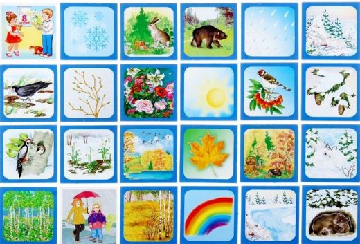 2) Каждый игрок получает по игровому полю с одним из времен года. Ведущий поочередно достает карточки, на которых изображены различные развлечение, популярные в то или иное время года, и показывает их игрокам. Карточку забирает тот, у кого на игровом поле изображено соответствующее время года. Победа достается тому, кто первым собирает все карточки-лото для своего времени года.