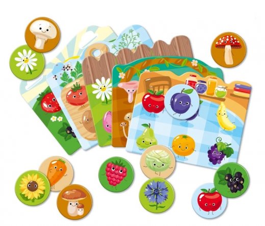 В картонном сундучке ребенок найдет 5 красочных карточек с изображением: полянки с ягодами; лужайки с цветами; стола с фруктами; разделочной доски с овощами; кузовка с грибами. А также 30 фишек с изображениями цветов, фруктов, овощей, ягод и грибов.