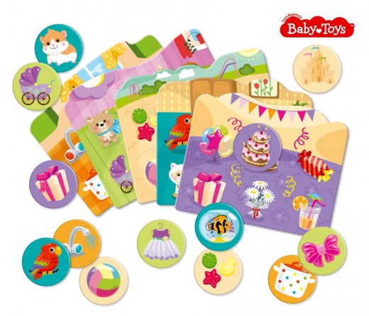В картонном сундучке ребенок найдет 5 красочных карточек на темы: наивкуснейшие сладости, приятный отдых на песчаном пляже, лучшие игрушки, кухня, и, конечно же, милые пушистые зверьки – грезы маленьких красавиц. А также 30 фишек с изображением предметов, нарисованных на карточках.