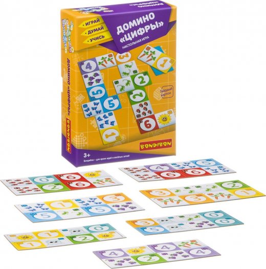 Настольная игра "Домино. Цифры Bondibon" - интересная игра, которая познакомит малышей с цифрами. На карточках домино с одной стороны указана цифра, а с другой нарисованы изображения, которые нужно сосчитать. При помощи карточек малыш учит цифры от 0 до 6.