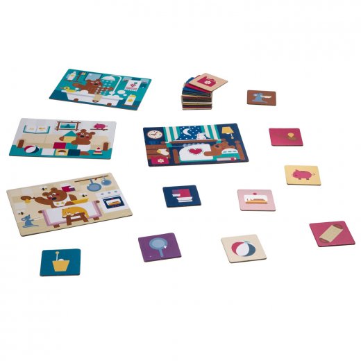 Лото "Мишкин дом Bondibon" - красочная игра для малышей на узнавание предметов. В комплект входят 4 большие карточки с изображением Мишкиного дома: ванной комнаты, кухни, детской и спальни, а также 24 маленькие карточки с увеличенными изображениями отдельных предметов из предложенных вариантов комнат.