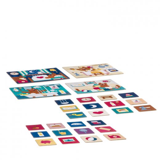 Ведущий берет карточку и показывает предмет, который на ней изображен. Малыш должен внимательно рассмотреть свою карточку. Если данный предмет есть на его карточке, то он забирает маленькую карточку себе и закрывает данный предмет. Игра продолжается до тех пор, пока один из игроков не закроет полностью свою большую карточку.