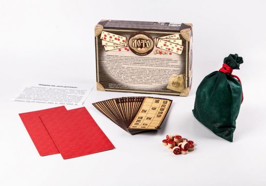 В комплект входят деревянные бочонки с цифрами от 1 до 90, 24 картонные карточки с цифрами, пластмассовые жетоны и текстильный мешочек, в который ведущий игры помещает деревянные бочонки.