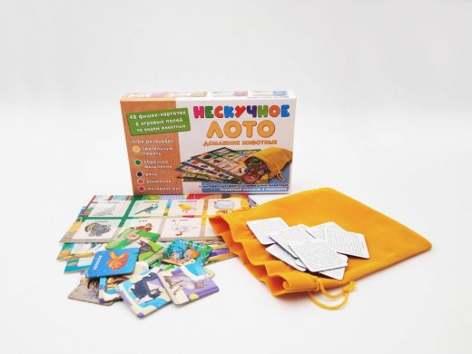 Нескучное лото "Домашние животные" представляет собой набор разделенных на квадраты полей-карточек с изображениями различных домашних животных и фишек-карточек, совпадающих с изображениями на полях.
