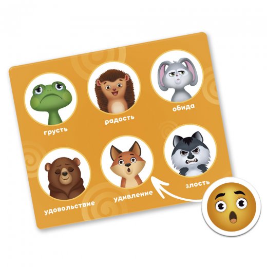 Раздайте карточки с животными, а фишки сложите в коробку. Ведущий достаёт одну фишку и называет эмоцию. Участник, который первым нашёл на своей карточке животное с такой же эмоцией, забирает фишку себе и закрывает картинку на своей карточке.