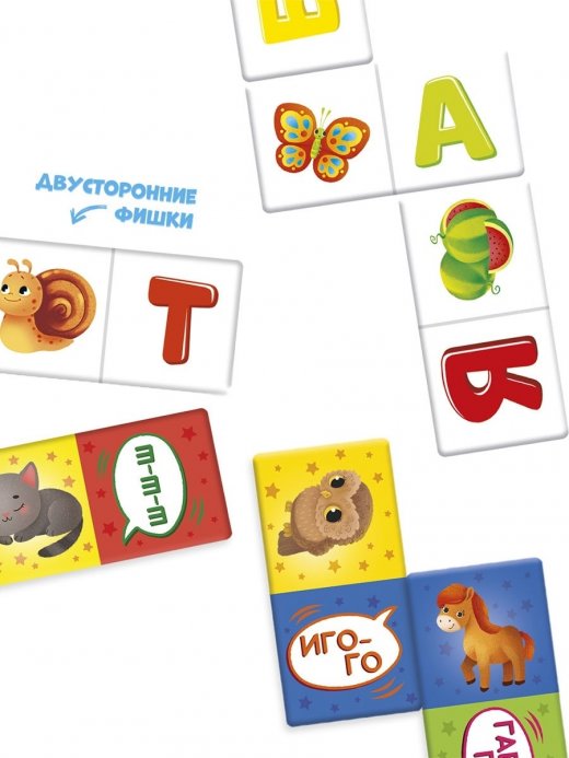 Домино для детей "Буквы и звуки" предназначено для игры малышей от 3 лет вместе с родителями или со старшими детьми. В игре 36 фишек, каждой стороной фишек можно играть в отдельную игру! На стороне с белым фоном - домино с буквами и рисунками, а на стороне с цветным фоном - животные и звуки, которые они издают. Обе игры собираются в круг. Играйте с детьми весело и запомнить алфавит будет легко.