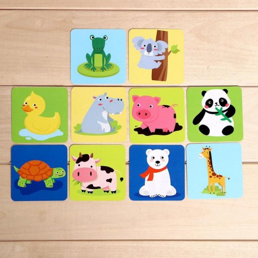 Настольная игра «Весёлые животные» познакомит малыша с питомцами. Благодаря мягким элементам кроха запомнит внешний вид зверей, их названия. Расскажите ребёнку про места обитания животных, их особенности.