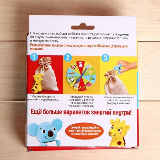 С помощью этого набора ребёнок научится распознавать предметы на ощупь, анализировать и принимать решения. Игра тренирует мелкую моторику, развивает речь и тактильные способности.